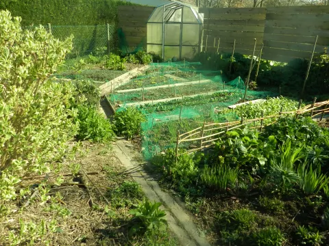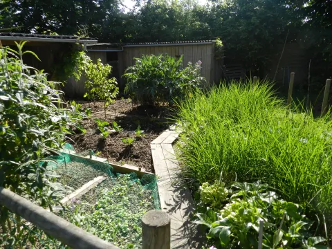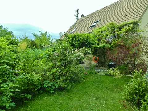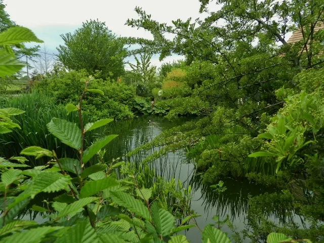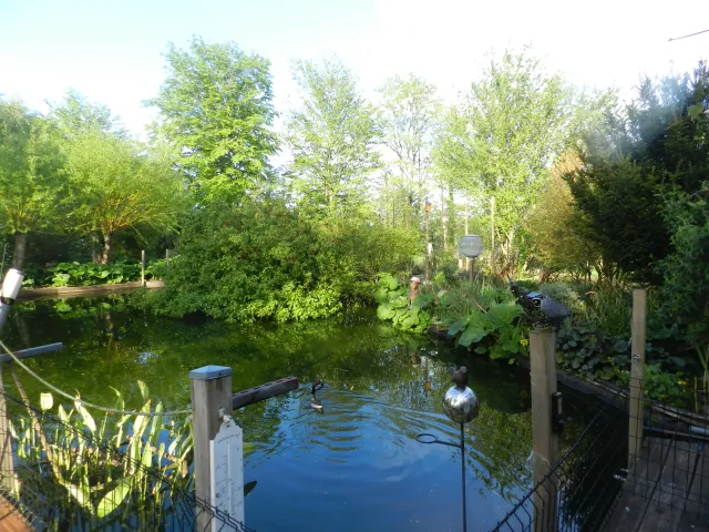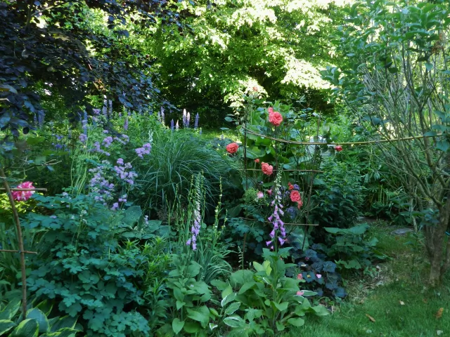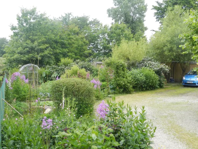 Un potager mêlant légumes, fruits rouges et vivaces n'est jamais traité. La mare de 300 m² est au milieu du jardin au pied de la véranda avec quelques canards. Les murs de la maison sont couvert de végétation (vigne vierges, glycines, vigne de coignet, hydragea grimpant et clématite). Des grands parterres de vivaces et d'arbustes composent une partie du jardin.