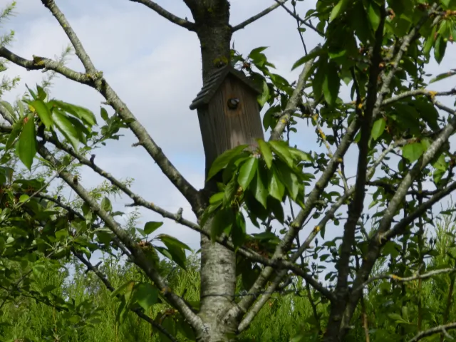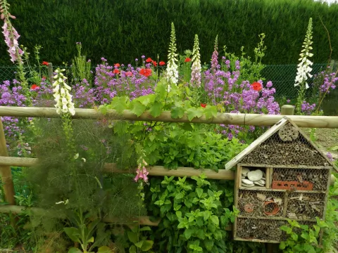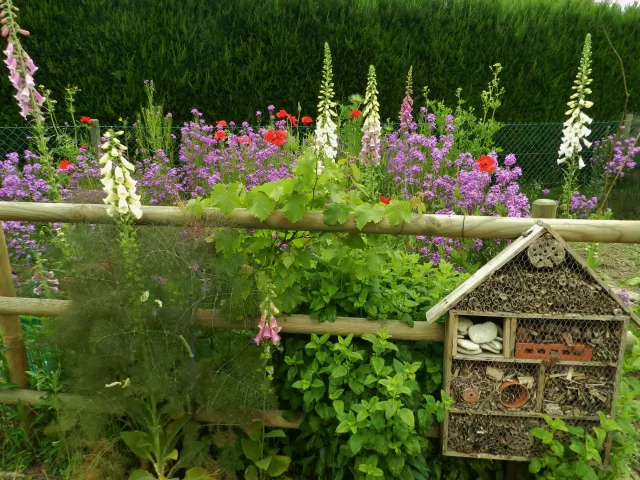 Nous avons installé des nichoirs pour les oiseaux sur tout le jardin, ainsi qu'un abris à chauve-souris sur la façade sud est. Nous avons même un poulailler avec une quinzaine de poules qui disposent d'un grand espace.