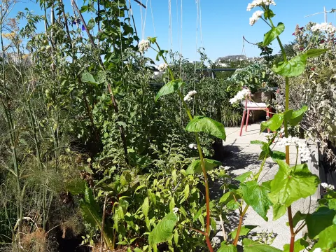 Avec un objectif de 0 produit de traitement et engrais, 0 achat de terreau, 100% de plants issus de mes semis et 100% de plantes comestibles. Plantes mellifères, légumes potagers, aromates, fines herbes, herbes médicinales, petits fruitiers, légumes perpétuels... Environ 70 variétés différentes de plantes comestibles remplacent petit à petit nos plantes ornementales sur les 30 mètres carré de notre terrasse en plein cœur de la ville.