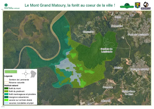 Avec ses 2129 ha, la Réserve naturelle du Mont Grand Matoury est la plus grande réserve périurbaine de France. Située sur le littoral, avec une altitude comprise entre 0 et 234 m, elle présente une mozaïque de la plupart des habitats naturels guyanais : forêt drainée, savanes, mangroves...