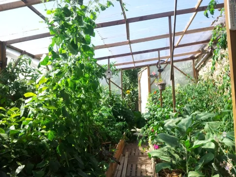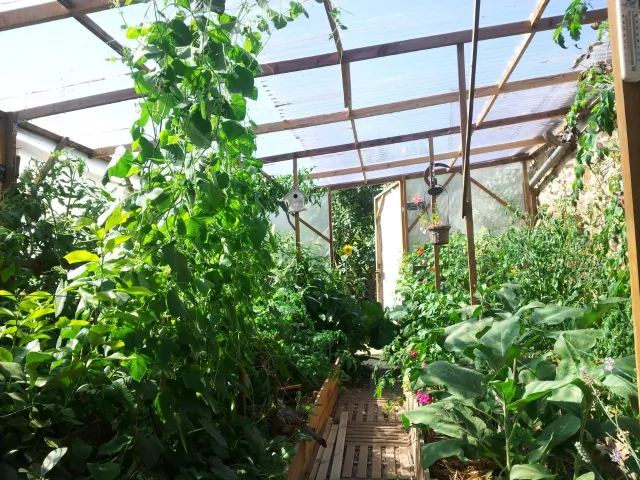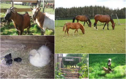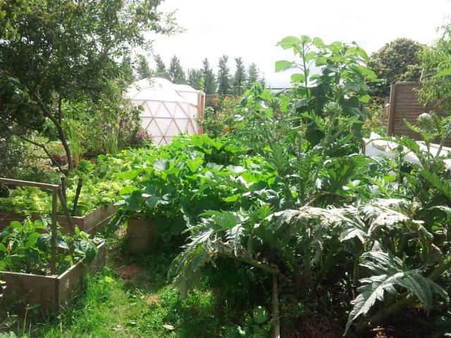 Pour vous accueillir nous disposons, d'un verger, d'un potager, d'un poulailler, de pâtures pour nos chevaux, chèvres et bélier, d'un jardin des simples et de serres et nous accueillons également beaucoup de plantes sauvages comestibles.