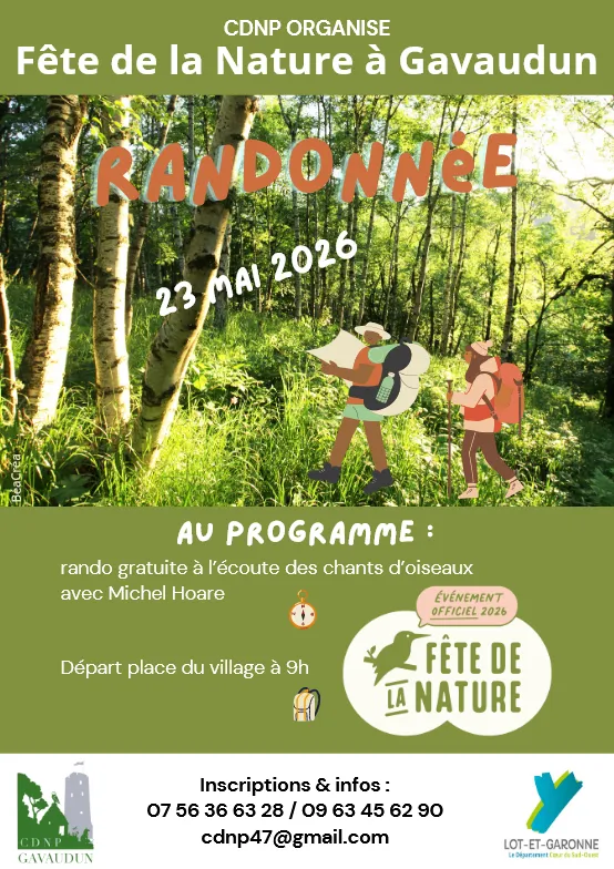 Accueil Édition 2026 A l'écoute des chants d'oiseaux Labellisé A l'écoute des chants d'oiseaux Type d'événement Balade ou randonnée guidée Milieu concerné Forêt Tous publics Gratuit Randonnée avec Michel Hoare "A l'écoute des chants d'oiseaux" Programme Randonnée en matinée Le 23 mai 2026, de 9h00 à 12h00 Randonnée d'environ 7km, guidée par Michel Hoare. A la découverte des chants d'oiseaux sur les chemins boisés de Gavaudun. Localisation Galerie d'images Fermer Événements à proximité