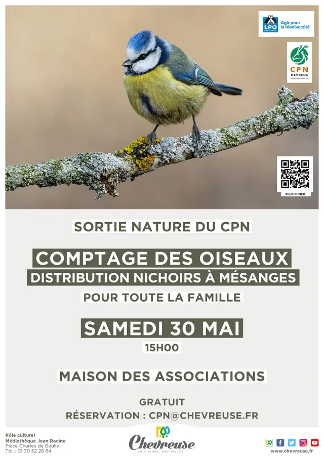 Accueil Édition 2026 Comptage des oiseaux Comptage des oiseaux Type d'événement Inventaire participatif Milieu concerné Forêt Tous publics Gratuit Sortie nature du CPN : comptage des oiseaux et distribution de nichoirs à mésanges. Programme Balade de comptage des oiseaux Le 30 mai 2026, de 15h00 à 17h00 Localisation Départ à 15h de la Maison des associations. Transports en commun RER/Train régional Bus Galerie d'images Fermer Ses autres événements Inauguration Inauguration de l'Archipel de la Vallée de Chevreuse Le 30 mai 2026 Chevreuse Tous les événements de cet acteur Événements à proximité