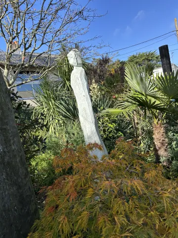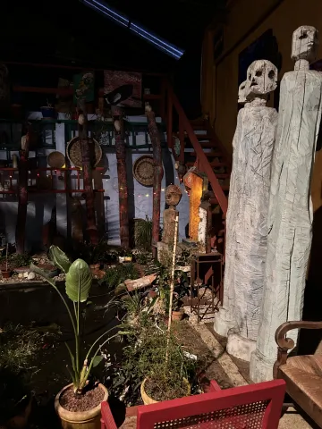 Accès au patio, véritable lieu de vie artistique agrémenté de végétaux, où se trouve un pin centenaire.